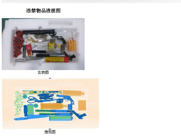 上圖為典型違禁品和比照物實(shí)物圖:刀具數(shù)把,打火機(jī),鞭炮,汽油、煤油、水、扳手、螺絲刀。