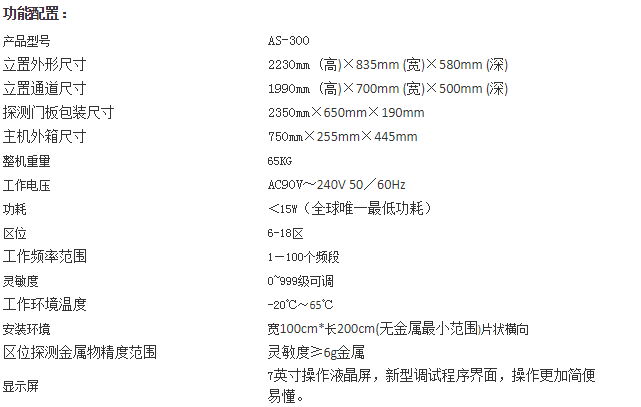 AS-300金屬探測安檢門該款高性能安檢門具有以下優(yōu)點:金屬探測靈敏度較高;抗干擾能力強;多個探測區(qū)域,每個區(qū)域都可以單獨設(shè)置靈敏度;自診斷程序,上電自檢;7寸大液晶操作屏;采用高強度材料,能防火,防腐蝕,防震等;可以實時監(jiān)視的背景環(huán)境干擾。